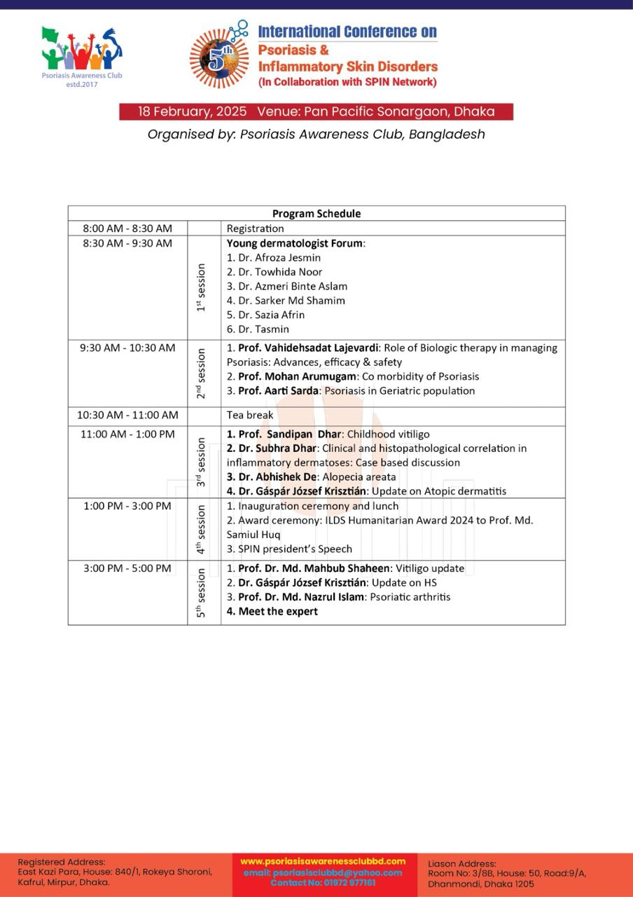 The Psoriasis Awareness Club Bangladesh organized, in collaboration with SPIN & IFPA, its 5th International Conference on Psoriasis & Inflammatory Skin Disorders